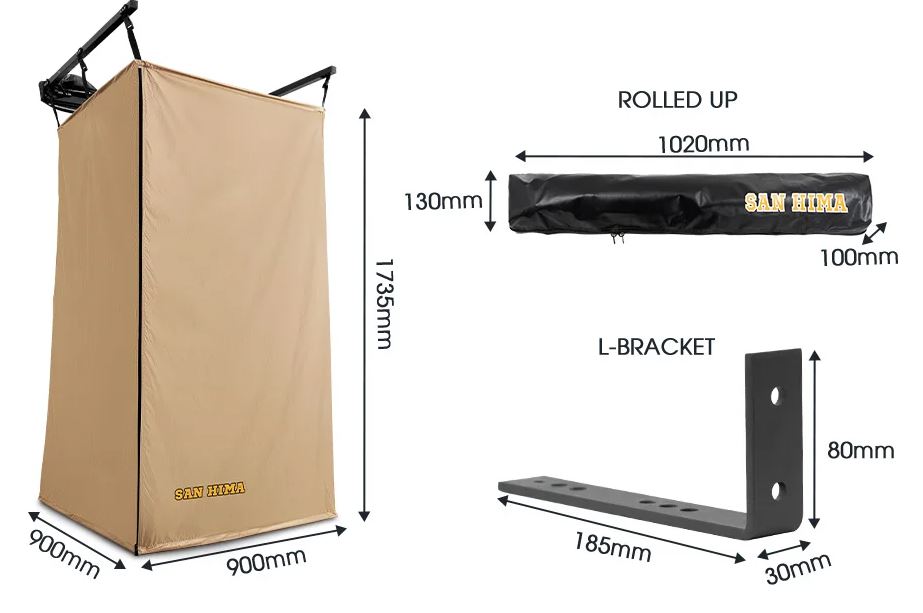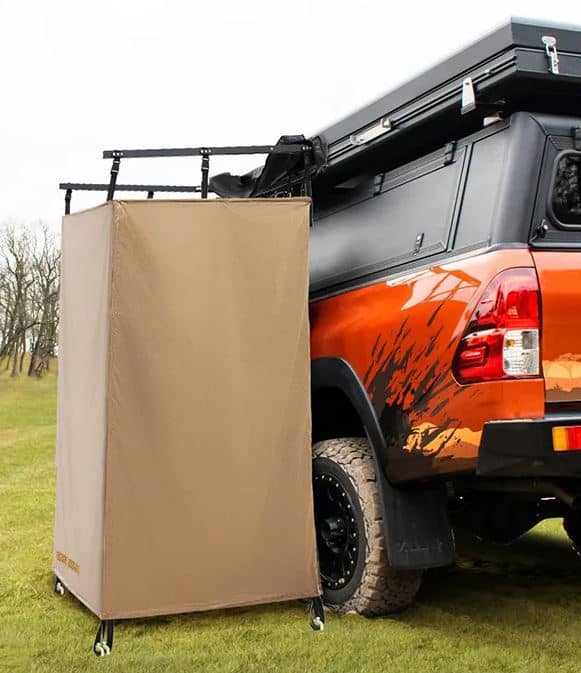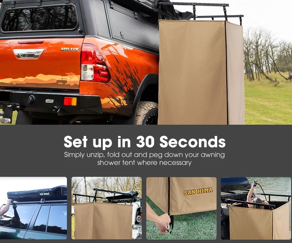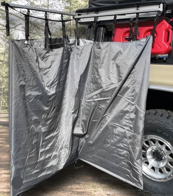 אוהל מקלחת המתחבר לגגון הרכב, משמש כמקלחת שטח, תא שרותים, תא הלבשה או כל שימוש אחר.